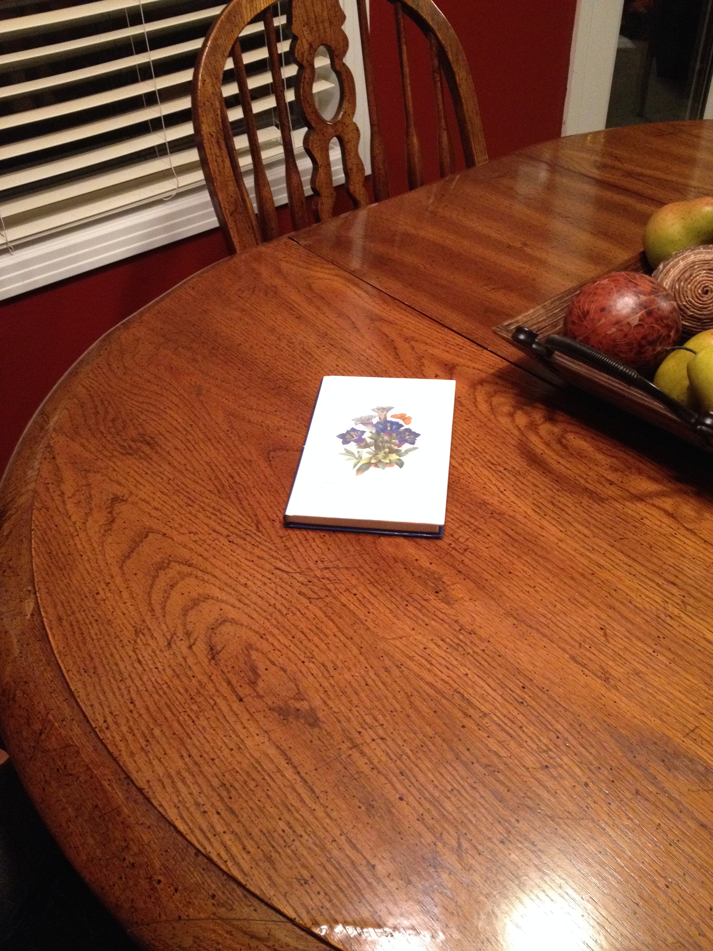 I don’t recognize this book, but it’s something that in my early twenties I would have thought looked sophisticated. My quick thought now is, “Huh. Kinda pretty, but isn’t me. That’s not mine. Is it? It’s not Grandma’s. I didn’t see it in her stuff …” I had helped her pack in a big ol’ hurry an hour after she called me to come get her, as she moved out of the guest room of her own home. I had toted to my car bags of everything from shampoo, tissue boxes, and a handful of clothing (her packing) to more clothes, medicine, and photo albums (my packing). I hadn’t seen this.